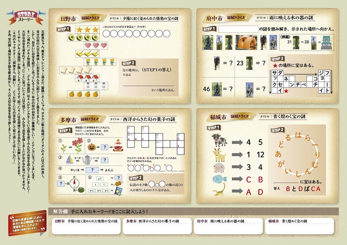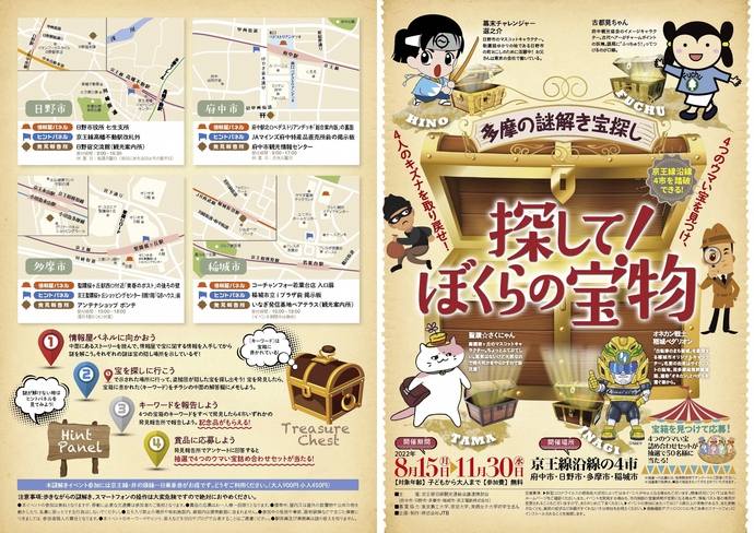 | 内容 | 京王線沿線を巡りながら、4つのまちにある隠された秘密の宝を探す周遊型の謎解きイベント。 すべてのミッションをクリアして宝箱を発見した後、発見報告所にお越しいただいた方には記念品をプレゼント |