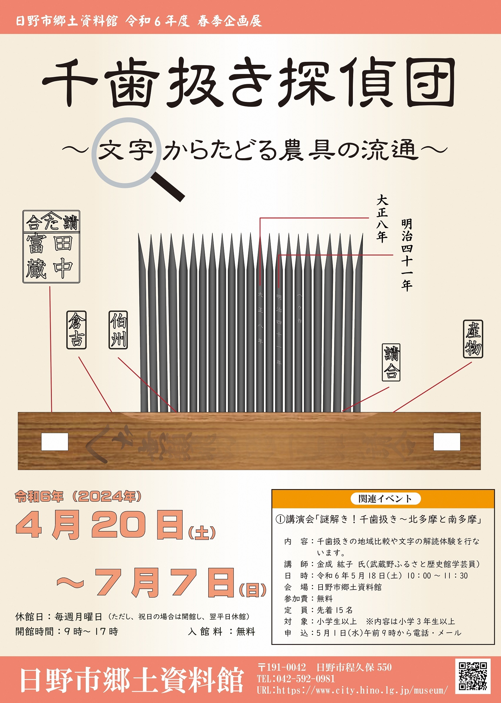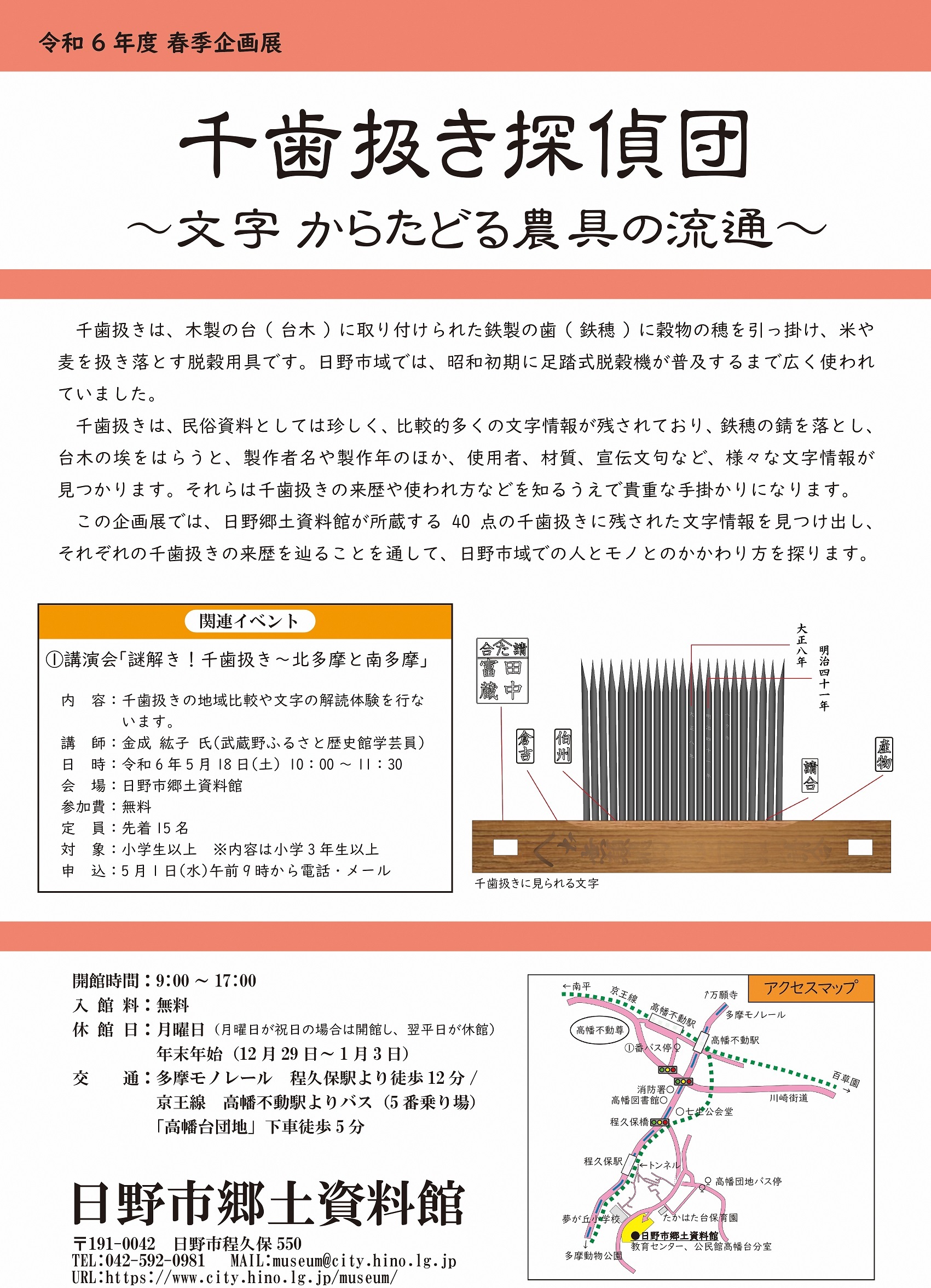 会期中5 月18日(土曜日)には、文字情報の解読を体験し、他地域と比較する講座「謎解き!千歯扱き 北多摩と南多摩」も開催します。
