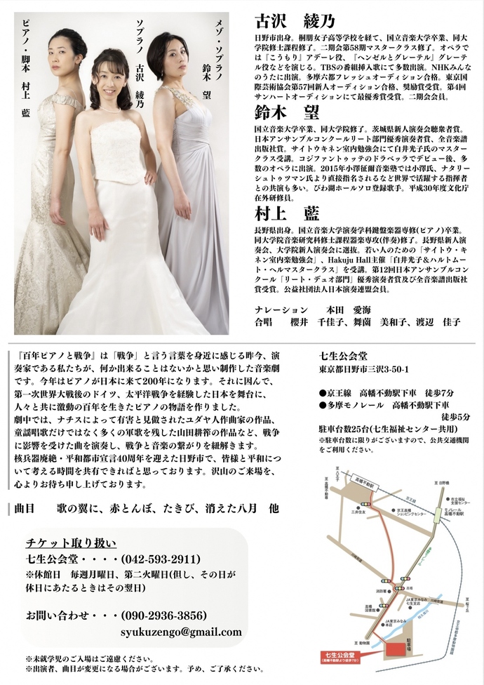 - (以下、チラシより抜粋した文章です) - 「百年ピアノと戦争」は「戦争」と言う言葉を身近に感じる昨今、演奏家である私たちが、何か出来ることはないかと思い制作した音楽劇です。今年はピアノが日本に来て200年になります。それに因んで、第一次世界大戦後のドイツ、太平洋戦争を経験した日本を舞台に、人々と共に激動の百年を生きたピアノの物語を作りました。 - 劇中では、ナチスによって有害と見做されたユダヤ人作曲家の作品、童謡唱歌だけではなく多くの軍歌を残した山田耕筰の作品など、戦争に影響を受けた曲を演奏し、戦争と音楽の繋がりを紐解きます。 - 核兵器廃絶・平和都市宣言40周年を迎えた日野市で、皆様と平和について考える時間を共有できればと思っております。 - 曲目・・・歌の翼に、赤とんぼ、たきび、消えた八月 他